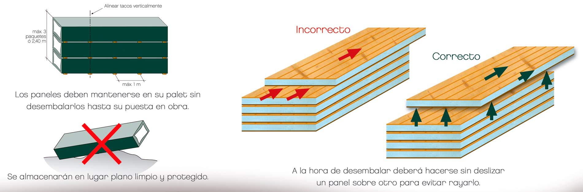 Los paneles se colocan en el sentido perpendicular al apoyo, y al menos deben ser fijados mecánicamente en tres apoyos. Se pueden colocar indistintamente de forma tradicional (juntas rectas) o al tresbolillo (alternando las juntas transversalmente).Las fijaciones mecánicas de los paneles serán tres por punto de apoyo. La tornillería será la específica para cada soporte, e irá separada entre sí un máximo de 30 cms.